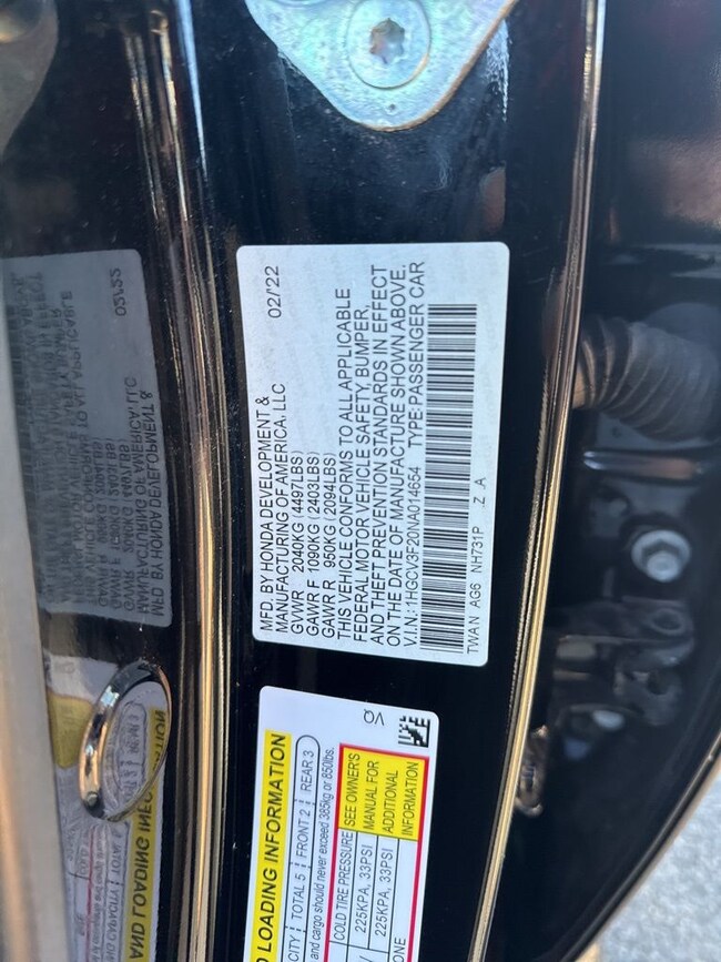 - VIN : 1HGCV3F20NA014654