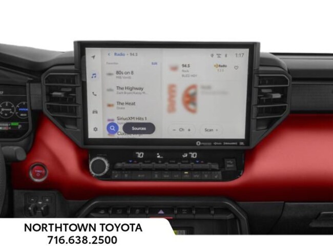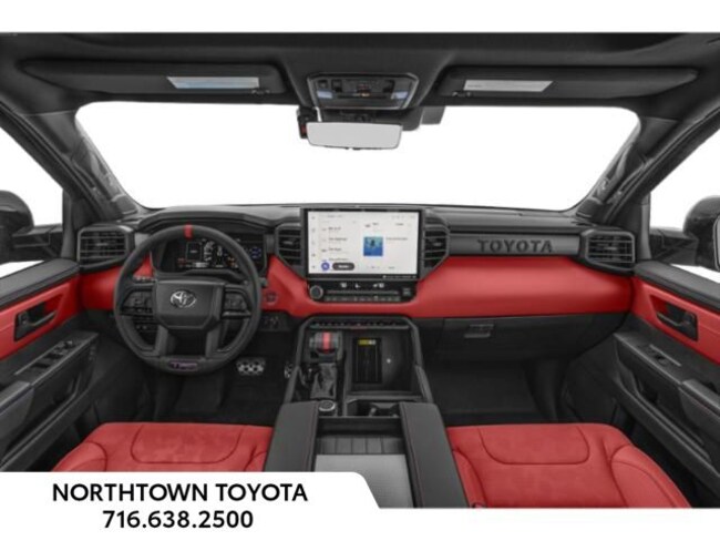 - Trd leather-wrapped manual tilt/telescopic steering wheel with trd badge, red center stripe, and phone, audio, display/infotainment, and driver assist controls.