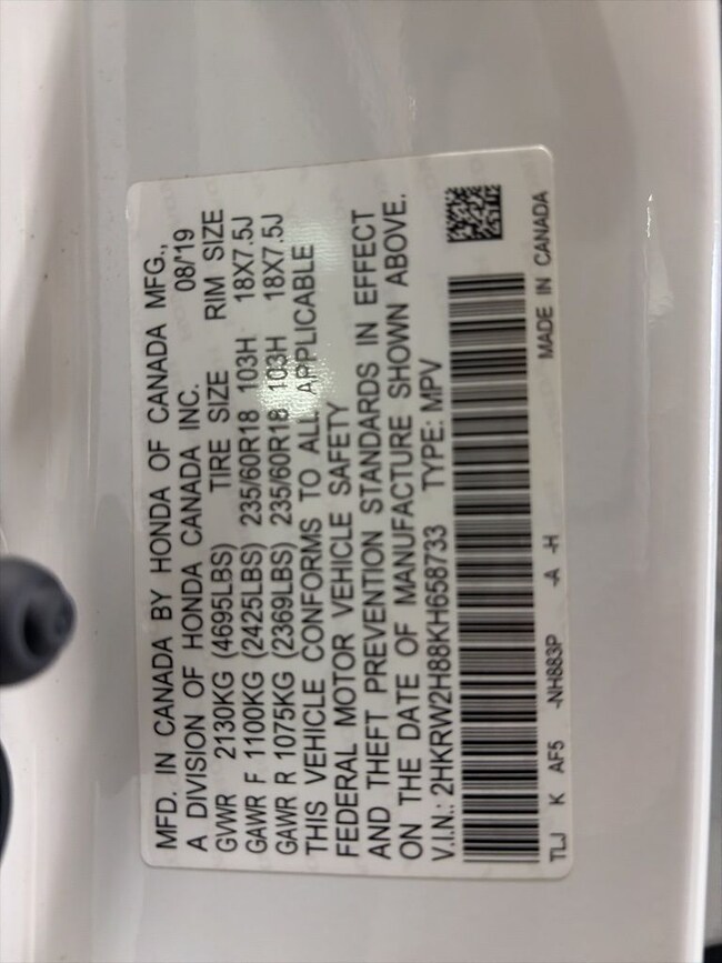 - VIN : 2HKRW2H88KH658733