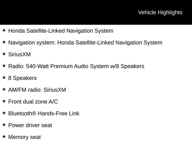 - Navigation system: Honda Satellite-Linked Navigation System